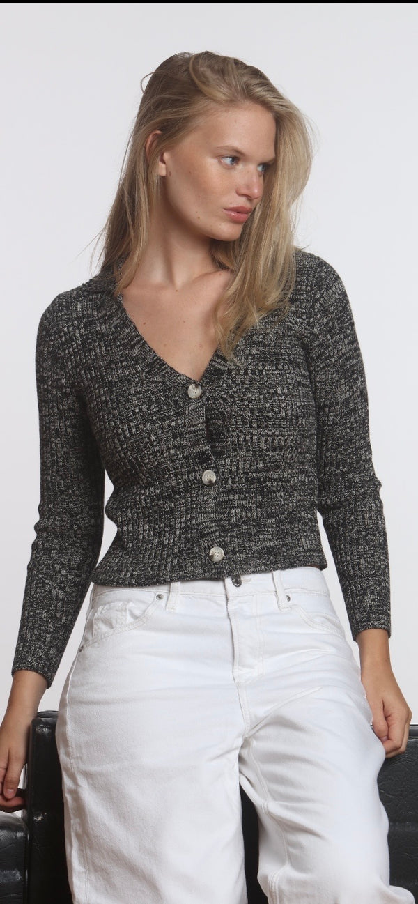 HASSON-Ribbed Polo Cardigan Black Melange